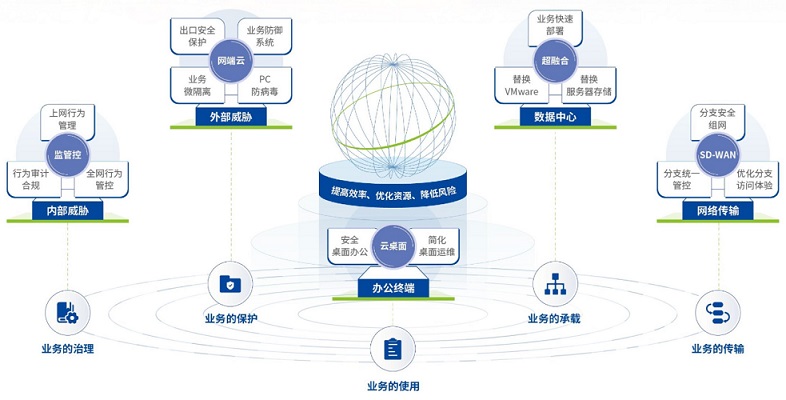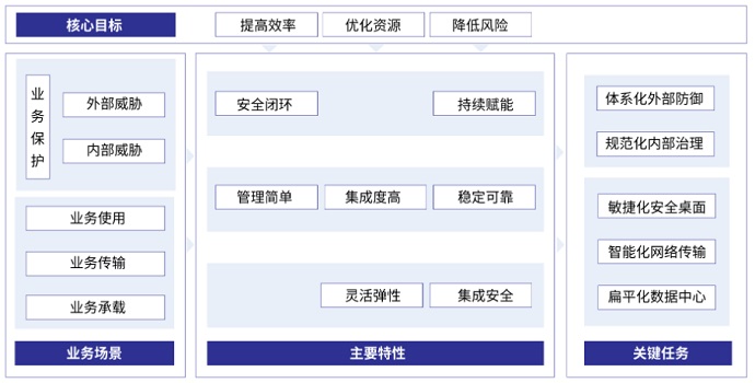 數(shù)字化轉(zhuǎn)型的核心目標(biāo)是“提高效率、優(yōu)化資源、降低風(fēng)險”,業(yè)務(wù)場景包含“業(yè)務(wù)保護(hù)、業(yè)務(wù)使用、業(yè)務(wù)傳輸、業(yè)務(wù)承載”,將核心目標(biāo)與業(yè)務(wù)場景相結(jié)合,可明確數(shù)字化轉(zhuǎn)型關(guān)鍵任務(wù)為“體系化外部防御、規(guī)范化內(nèi)部治理、敏捷化安全桌面、智能化網(wǎng)絡(luò)傳輸、扁平化數(shù)據(jù)中心”。企業(yè)可進(jìn)一步結(jié)合自身的發(fā)展情況,從最為緊迫的關(guān)鍵任務(wù)入手,一步步走好轉(zhuǎn)型之路。